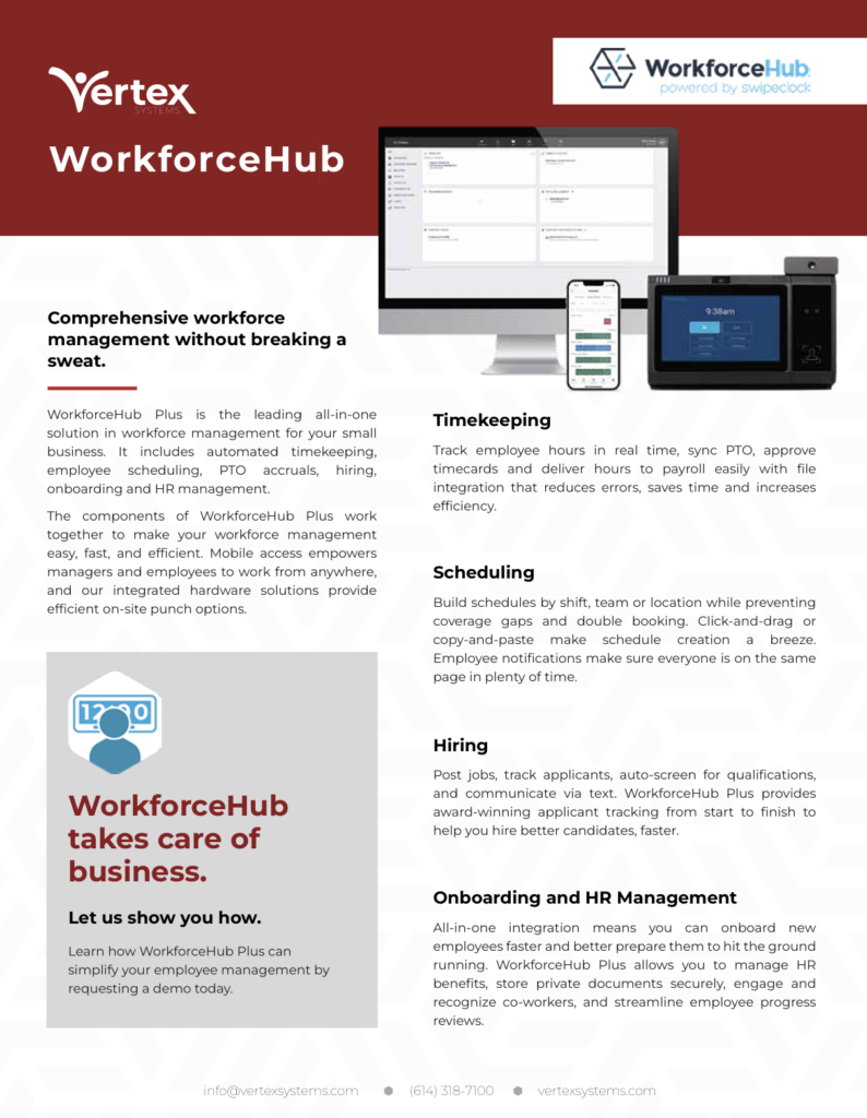 WorkforceHub Plus is the leading all-in-one solution in workforce management for your small business. It includes automated timekeeping, employee scheduling, PTO accruals, hiring, onboarding and HR management.